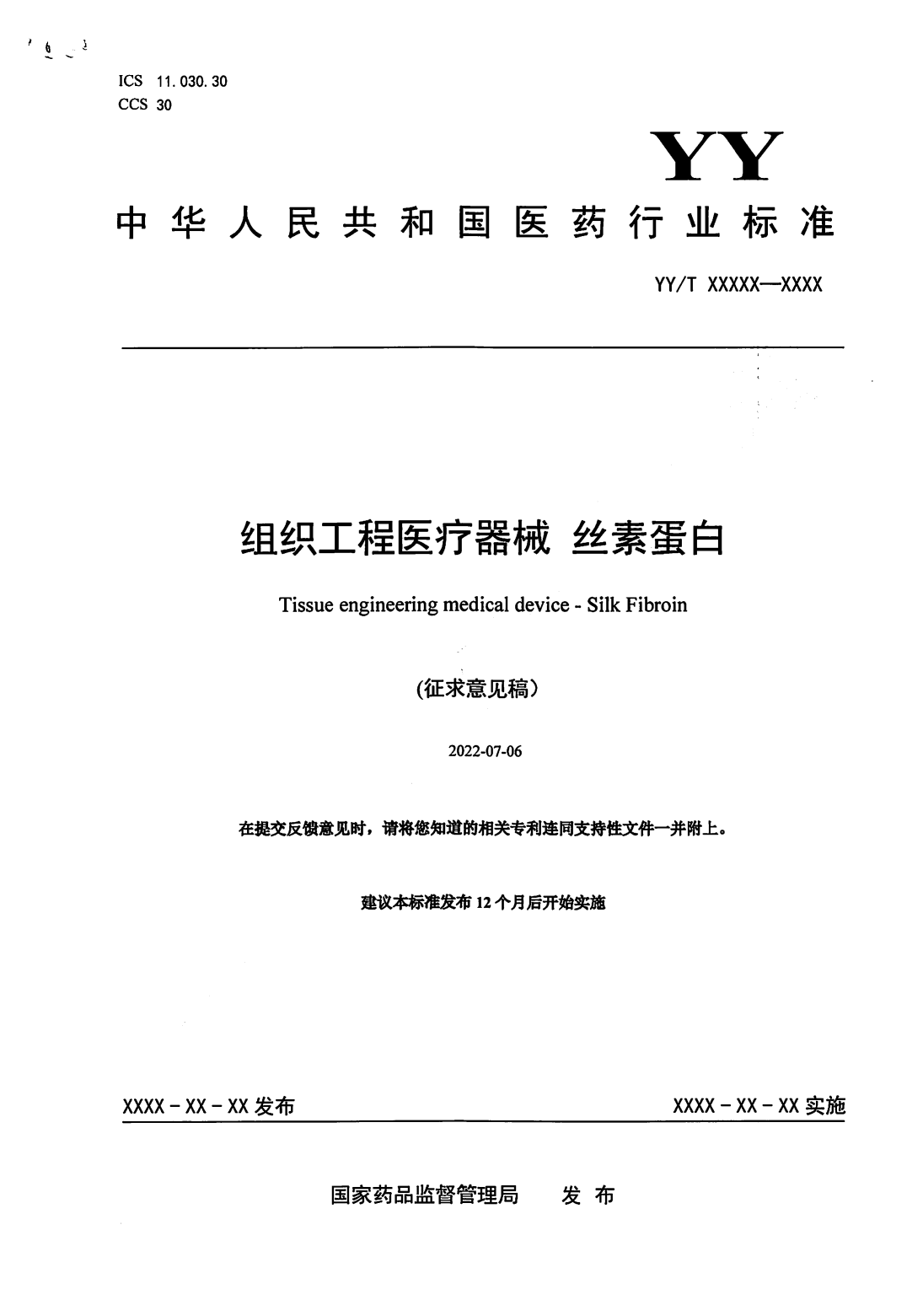 隨著絲素蛋白醫(yī)療器械產(chǎn)品的增加,對(duì)這一材料的生產(chǎn)制備、質(zhì)量控制等提出了要求。相對(duì)于產(chǎn)業(yè)的迅速發(fā)展,絲素蛋白相關(guān)標(biāo)準(zhǔn)在國際國內(nèi)仍處于空白。由于標(biāo)準(zhǔn)的缺乏,各絲素蛋白企業(yè)在企業(yè)標(biāo)準(zhǔn)制定過程中無統(tǒng)一的標(biāo)準(zhǔn)參考依據(jù),限制了絲素蛋白醫(yī)療產(chǎn)業(yè)的高質(zhì)量發(fā)展。目前,為提高絲素蛋白材料的質(zhì)量與安全性,為科學(xué)監(jiān)管提供支撐,由全國外科植入物和矯形器械標(biāo)準(zhǔn)化技術(shù)委員會(huì)組織工程醫(yī)療器械產(chǎn)品分技術(shù)委員會(huì)歸口的《組織工程醫(yī)療器械絲素蛋白》已形成征求意見稿[5],并于2022年8月23日-2022年10月24日期間公開征求意見。