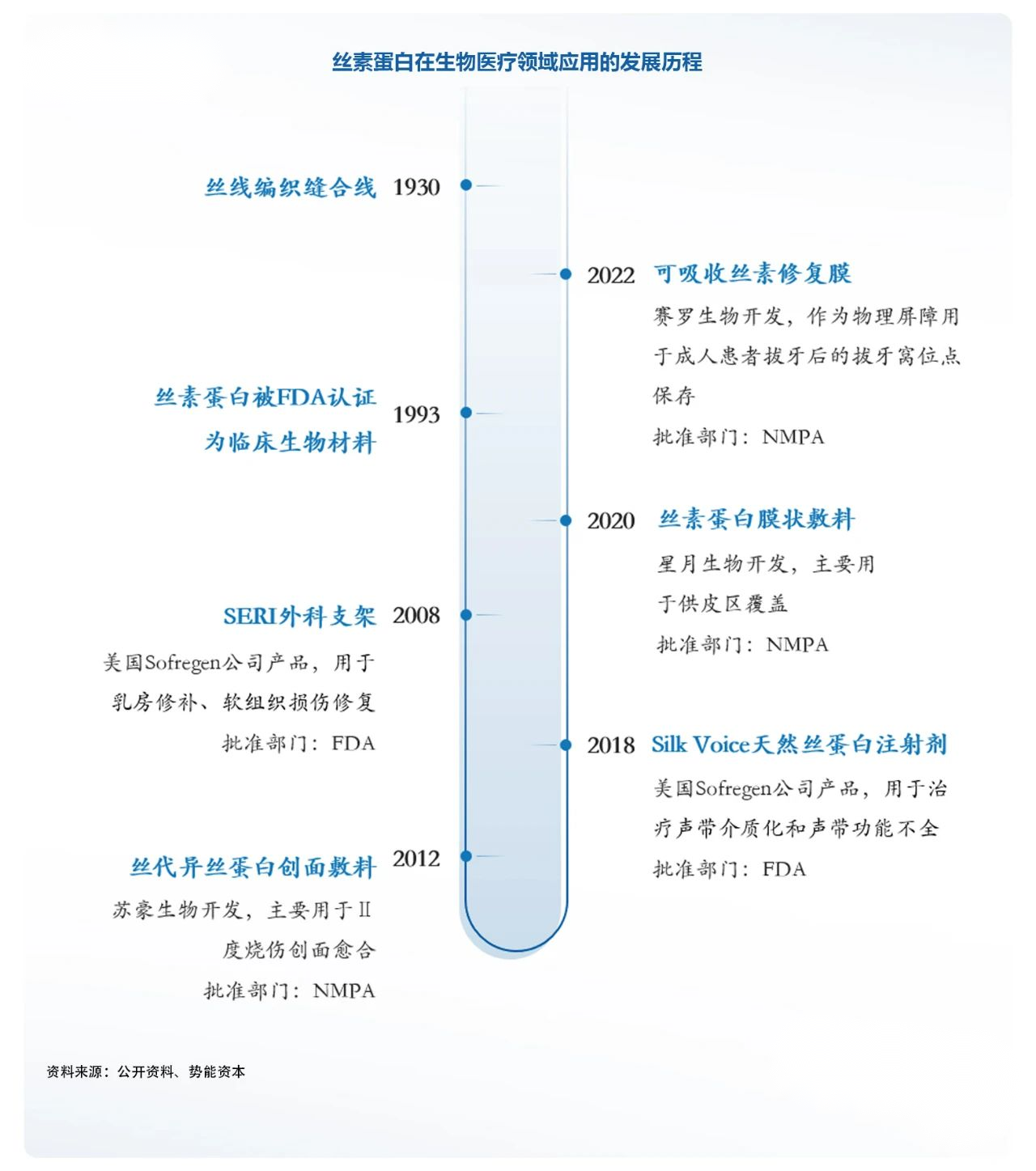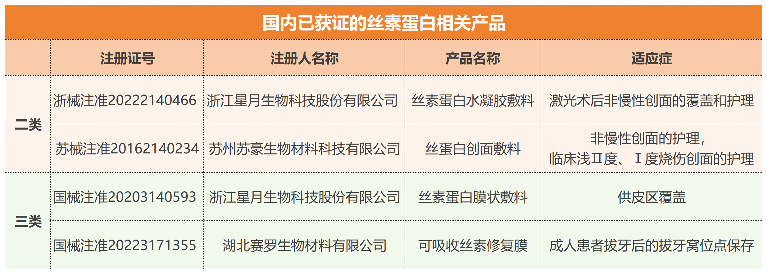 市面已對(duì)絲素蛋白制備的做了廣泛探究,目前成功商業(yè)化的產(chǎn)品不多(蠶絲縫合線、SERI外科支架、絲蛋白創(chuàng)面敷料、可吸收手術(shù)修復(fù)膜、Silk Voice®注射劑等),目前國內(nèi)共四款絲素蛋白產(chǎn)品獲批,其中僅一款為可吸收產(chǎn)品,說明市場(chǎng)仍具有巨大發(fā)展?jié)摿Α?/em>