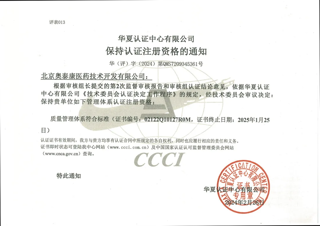 2024年3月,北京奧泰康醫(yī)藥技術(shù)開發(fā)有限公司經(jīng)華夏認(rèn)證中心有限公司(CCCI)認(rèn)證,順利通過ISO9001:2015 標(biāo)準(zhǔn)質(zhì)量管理體系認(rèn)證年度審核,認(rèn)證范圍為醫(yī)療器械臨床試驗(yàn)及產(chǎn)品注冊服務(wù)。嚴(yán)格的質(zhì)量管理體系是企業(yè)持續(xù)、穩(wěn)定、健康發(fā)展的根本保證,通過ISO9001認(rèn)證標(biāo)志著我司的醫(yī)療器械臨床試驗(yàn)及產(chǎn)品注冊服務(wù)與管理體系已達(dá)到了國際標(biāo)準(zhǔn)、行業(yè)標(biāo)準(zhǔn),在制度化、體系化和標(biāo)準(zhǔn)化方面取得了里程碑式的進(jìn)展。