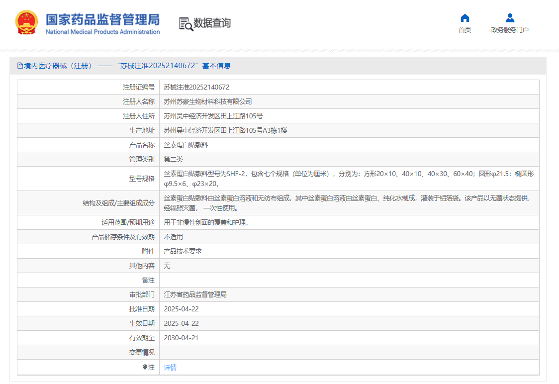 2025年4月22日,經國家藥品監(jiān)督管理局公示,奧泰康蘇州CDMO中心研發(fā)的絲素蛋白貼敷料(蘇械注準20252140672)獲得NMPA批準上市,產品獲批國家第二類醫(yī)療器械注冊證。