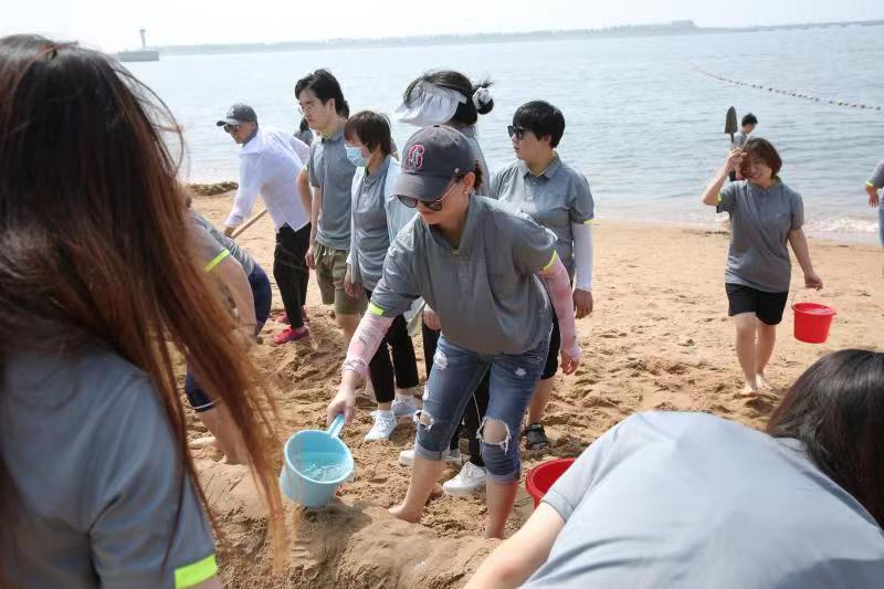 海邊沙灘,全體奧泰康人共同構(gòu)筑了一座長(zhǎng)40余米、高1米的沙雕長(zhǎng)城,每組隊(duì)員分工明確—鏟沙、運(yùn)水、堆砌,聚沙成塔,經(jīng)過兩小時(shí)的共同搭建,眾志成城,一座巍峨壯闊的沙雕長(zhǎng)城矗立在沙灘上。