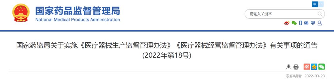 國(guó)家藥監(jiān)局關(guān)于實(shí)施《醫(yī)療器械生產(chǎn)監(jiān)督管理辦法》《醫(yī)療器械經(jīng)營(yíng)監(jiān)督管理辦法》有關(guān)事項(xiàng)的通告(2022年第18號(hào))