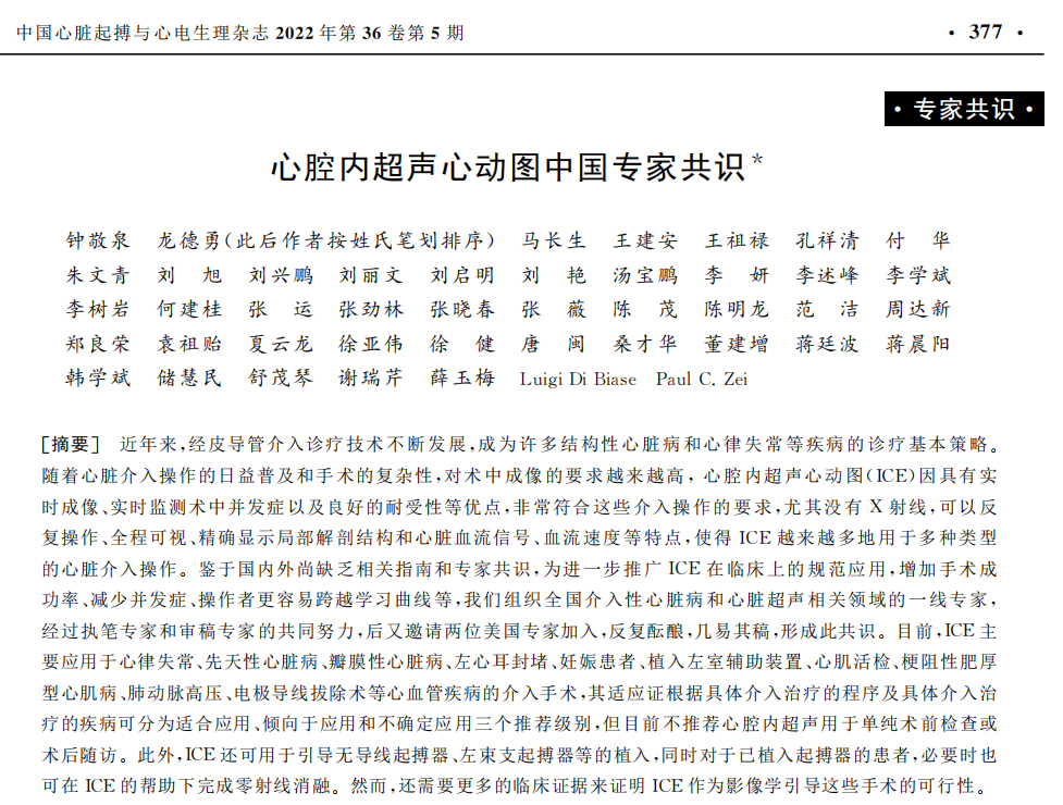 鑒于目前國際上缺乏相關(guān)指南,為促進(jìn)和規(guī)范ICE的臨床應(yīng)用,為臨床醫(yī)生提供指導(dǎo),進(jìn)一步完善心血管介入診斷和治療方案,2022年10月,由國內(nèi)外數(shù)十位頂尖專家學(xué)者編寫完成全球首個心腔內(nèi)超聲專家共識,聯(lián)合在Frontiers in Cardiovascular Medicine上發(fā)表,推動了心腔內(nèi)超聲心血管介入領(lǐng)域的的規(guī)范化應(yīng)用。