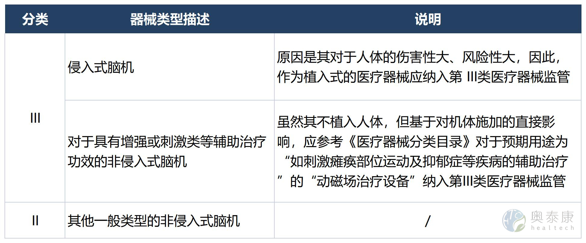 腦機接口技術(shù)需要大規(guī)模的臨床試驗和更加嚴謹?shù)囊?guī)范來推動其順利落地應(yīng)用,依據(jù)影響醫(yī)療器械風(fēng)險程度的因素、風(fēng)險程度高低兩類判斷標準,目前,腦機接口臨床試驗規(guī)范還需要更加完善和細化,例如腦機接口臨床準入細則、數(shù)據(jù)采集、處理、分析以及治療效果評估等等方面的指導(dǎo),以確保在腦機接口產(chǎn)品的開發(fā)和推廣過程中不會出現(xiàn)安全隱患。《醫(yī)療器械分類目錄》規(guī)定腦機接口設(shè)備的分類監(jiān)管要求如下: