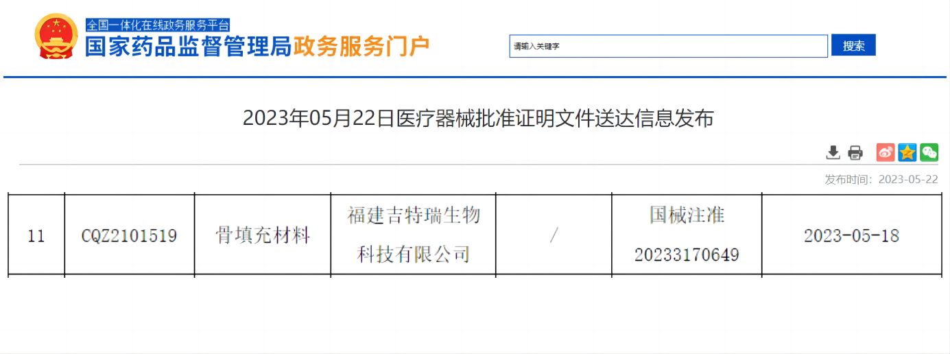 「MA成果發(fā)布」福建吉特瑞·骨填充材料獲證——2023年「第9張」三類醫(yī)療器械注冊(cè)證???