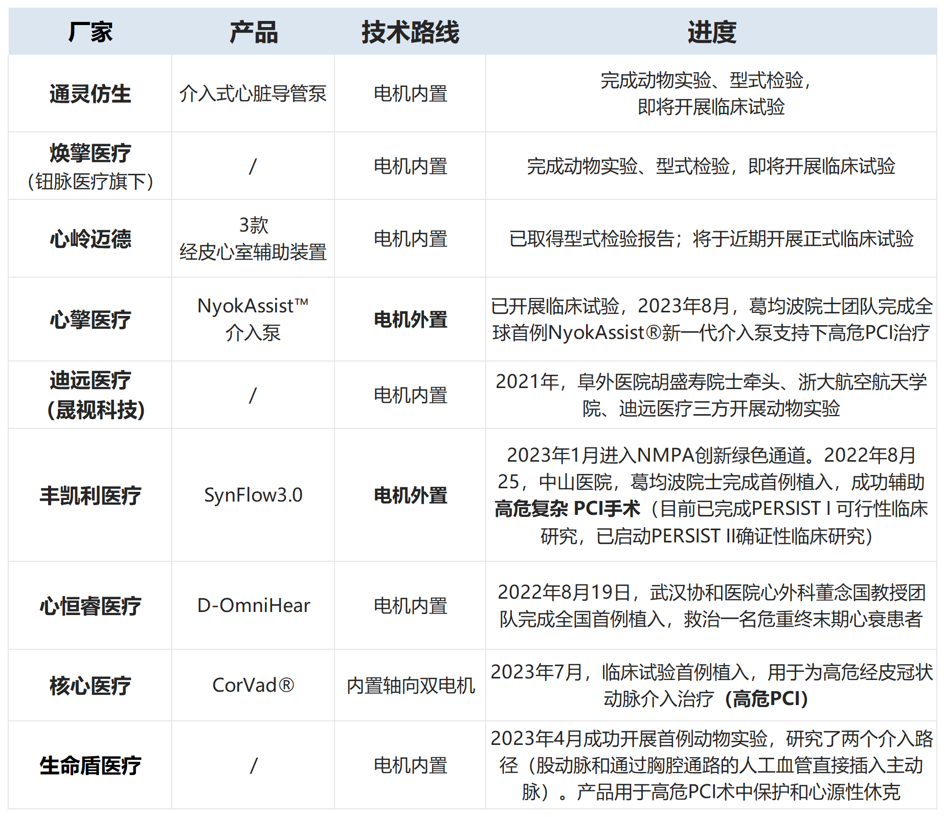 介入式人工心臟是高技術(shù)、高門檻賽道,國(guó)內(nèi)有少數(shù)創(chuàng)新企業(yè)布局。其中,心恒睿醫(yī)療、核心醫(yī)療、通靈仿生、心嶺邁德、晟視科技、心擎醫(yī)療、豐凱利醫(yī)療等企業(yè)不僅在資本寒冬期逆勢(shì)完成融資,且相關(guān)產(chǎn)品推進(jìn)順利,進(jìn)展極快。