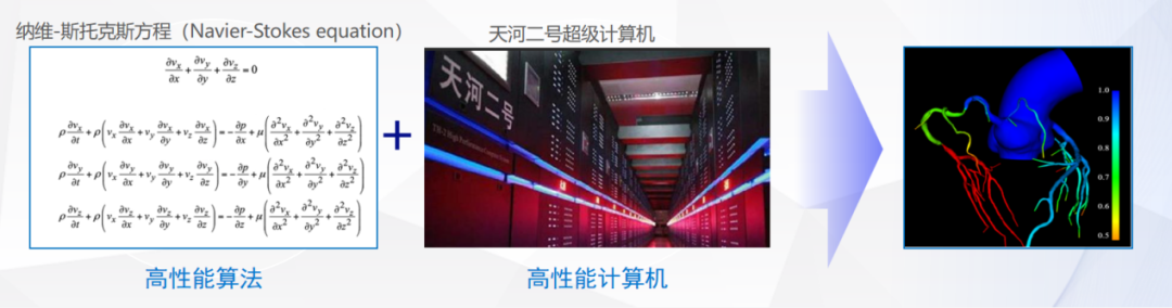 眾所周知, FFR是心肌缺血評價的“金標準”,是臨床判斷是否對冠心病患者施血管內(nèi)干預治療的主要依據(jù)。傳統(tǒng)方法是通過有創(chuàng)方法獲得,近年來隨著計算機技術(shù)的迅速發(fā)展,基于CT的無創(chuàng)FFR測量技術(shù)(即FFRCT)得到了快速發(fā)展。該技術(shù)起源于美國HeartFlow公司,其基本原理是基于常規(guī)CCTA所獲得的冠狀動脈三維圖像,采用流體力學方程(納維斯托克斯方程)在高性能計算機(超級計算機)上進行流體力學仿真計算,獲得冠狀動脈內(nèi)血流動力學參數(shù),例如血壓、血流速度、血流量等,進而得到血流儲備分數(shù)(FFR)(圖2)。