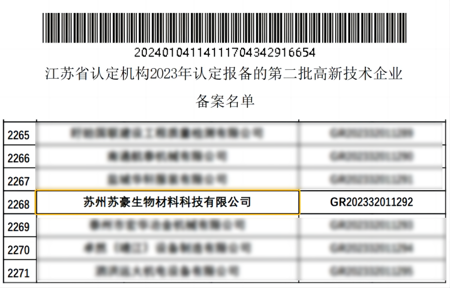 根據(jù)《高新技術(shù)企業(yè)認定管理辦法》和《高新技術(shù)企業(yè)認定管理工作指引》有關(guān)規(guī)定,全國高新技術(shù)企業(yè)認定管理工作領(lǐng)導(dǎo)小組辦公室公告了江蘇省認定機構(gòu)2023年認定報備的第二批高新技術(shù)企業(yè)名單,奧泰康蘇州CDMO中心——蘇州蘇豪生物材料科技有限公司榮列其中,獲得江蘇省高新技術(shù)企業(yè)認定,這是奧泰康企業(yè)發(fā)展歷程中的重要里程碑。