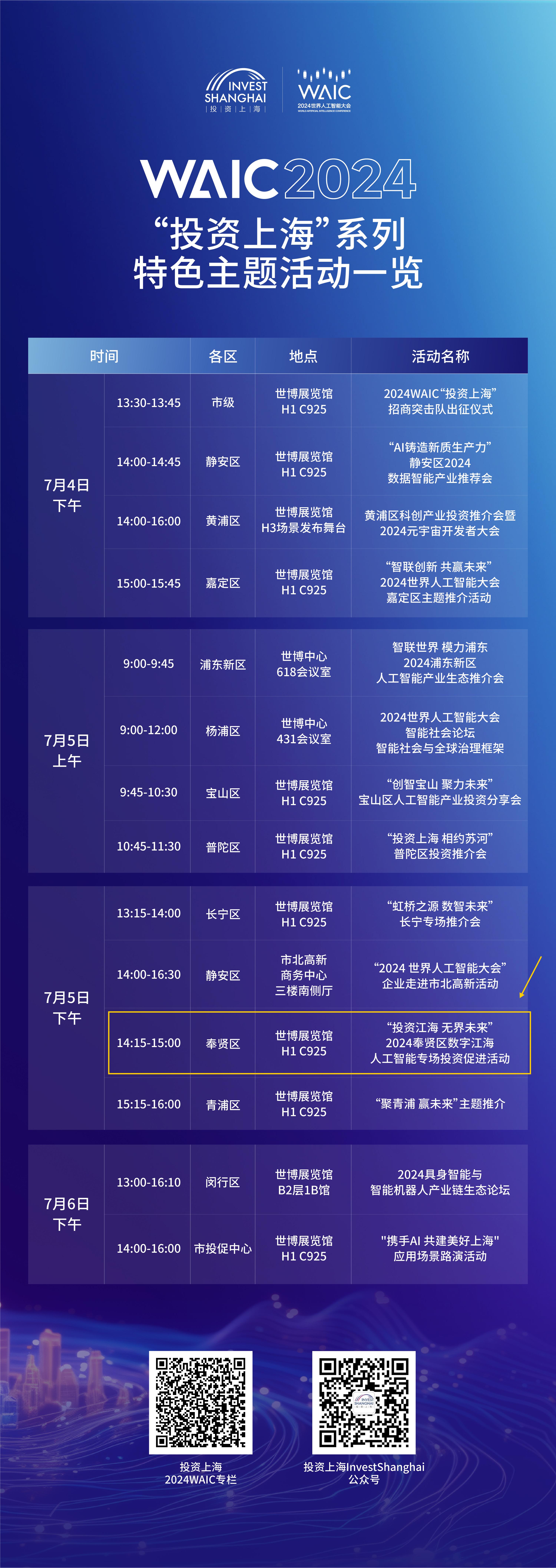 WAIC 2024是人工智能行業(yè)的世界盛會,為把握大會激發(fā)的全新投資機(jī)遇,推動展商變投資商,市投促中心聯(lián)合各區(qū)投促部門,將在大會期間舉辦一系列精彩紛呈的特色主題活動,向世界分享上海AI產(chǎn)業(yè)投資機(jī)遇。奧泰康受邀參加【“投資上海”系列特色主題活動】,并在“投資江海 無界未來”2024奉賢區(qū)數(shù)字江海人工智能專場投資促進(jìn)活動專場圍繞腦機(jī)接口領(lǐng)域展開主題分享,屆時將與醫(yī)療行業(yè)同仁共同交流,期待各位蒞臨現(xiàn)場。