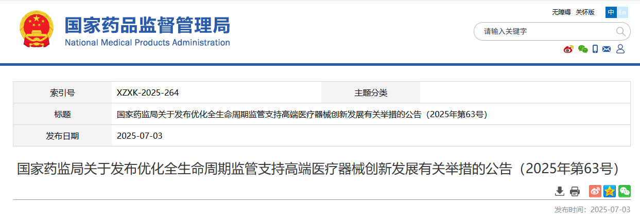 國家藥監(jiān)局關(guān)于發(fā)布優(yōu)化全生命周期監(jiān)管支持「高端醫(yī)療器械」創(chuàng)新發(fā)展有關(guān)舉措的公告(2025年第63號)