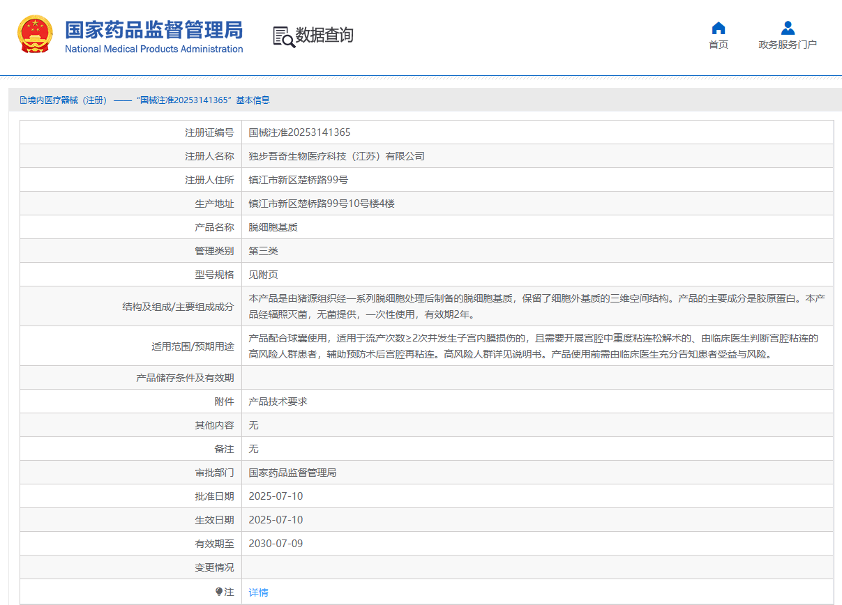 近期,經(jīng)國家藥品監(jiān)督管理局公示,獨(dú)步吾奇生物醫(yī)療科技(江蘇)有限公司自主研發(fā)的產(chǎn)品脫細(xì)胞基質(zhì)(國械注準(zhǔn)20253141365 )獲得NMPA批準(zhǔn)上市,奧泰康提供MA解決方案。